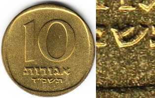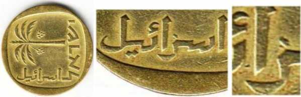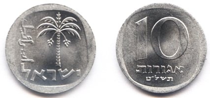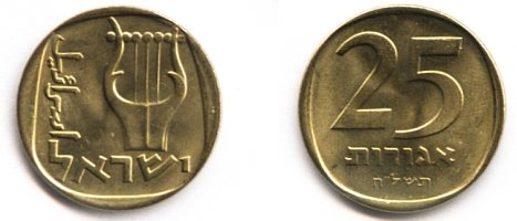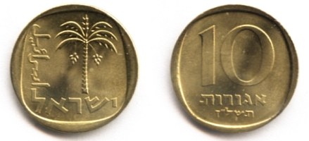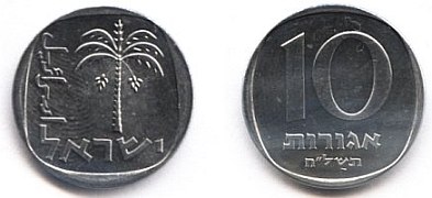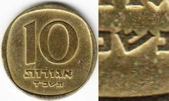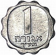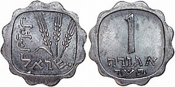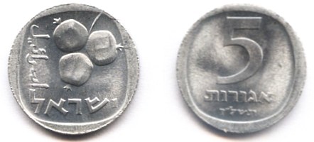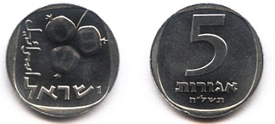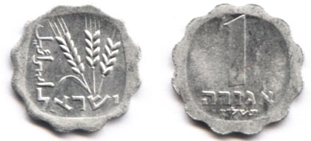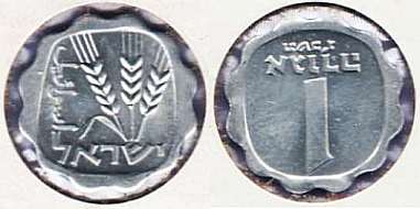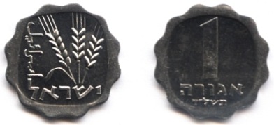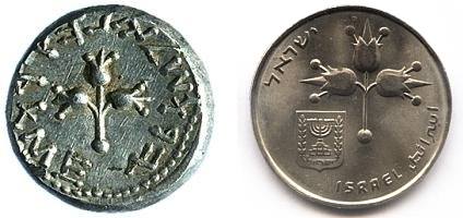 On the obverse of the 1 Agora coin appear three ears of barley. The original coin, from which the design was taken, was minted during the reign of Agrippa I (37 - 44 AD). |