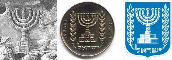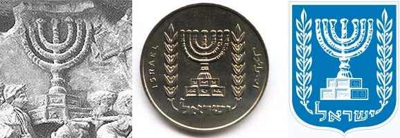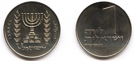 The obverse of the 1 Lira (type I) trade coin shows the Menorah in its official form as Israel's State emblem. The best known origin of the modern design can be seen on the Arch of Titus in Rome, where The Sack of Jerusalem by Titus in 70 AD is illustrated in the finest detail. The modern State emblem exemplifies the resurrection of the People of Israel, almost 1900 years after the destruction of the Second Temple. |