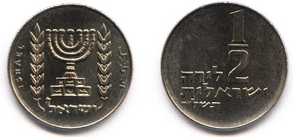 The obverse of the ½ Lira trade coin shows the Menorah in its official form as Israel's State emblem. The best known origin of the modern design can be seen on the Arch of Titus in Rome, where The Sack of Jerusalem by Titus in 70 AD is illustrated in the finest detail. The modern State emblem exemplifies the resurrection of the People of Israel, almost 1900 years after the destruction of the Second Temple |