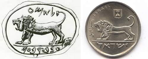 The origin and whereabouts of the Roaring Lion on the obverse of the 5 Lirot trade coin remain one of the greatest mysteries of Holy Land archaeology since 1903, when it was discovered at Megiddo by Gottlieb Schumacher, a German railway engineer (the Dera'a to Haifa branch line of the Hedjaz railway was built under his management) cum archaeologist, born in a Templar community in Haifa. The depiction in great detail of the King of Beasts appears on a seal, inscribed with the words "Shema Servant of Jerobeam". As two kings with the same name, Jerobeam I and Jerobeam II, ruled the kingdom of Israel, it is believed that Shema was a high official of king Jerobeam II (8th Century BC). Shortly after its discovery, Schumacher presented the seal as a gift to the Ottoman sultan Abd-el Hamid II. Since then the "Seal of Shema" has mysteriously vanished, never to be seen again. A plaster copy was made prior to its handover to the sultan, preserving this beautiful piece of Biblical history for posterity. |