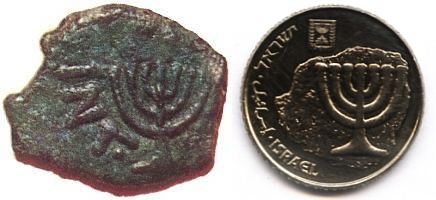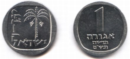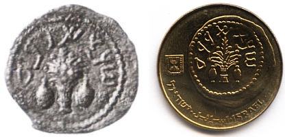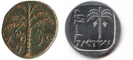 The 1 New Agora trade coin is modeled after a series of bronze coins, issued by Simon Bar Kochba during the second Jewish revolt against the Roman Empire (132 - 135 AD). The ancient coin shown here depicts a palm tree with ripe dates, is inscribed "Shimon" and undated. |