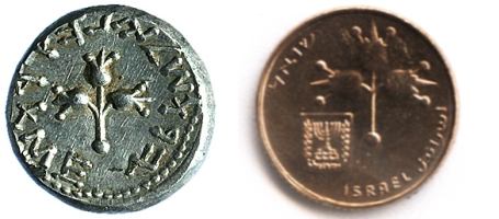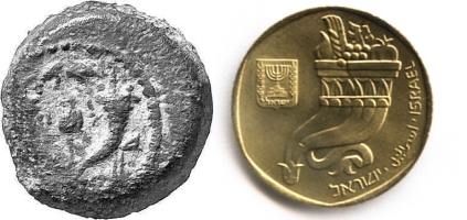 The 10 New Agorot coin depicts a High priest staff with three buds of pomegranates, as it appeared on a silver coin minted in Jerusalem during the first revolt against the Romans (66 - 70 AD). |