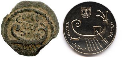 The motif on the obverse of the 10 Sheqalim trade coin was taken from a coin depicting a war galley, issued by Herod Archelaus, Ethnarch of Samaria, Judea and Idumea. Most coins minted during his rule (4 BC - 6 AD) have a nautical theme. |