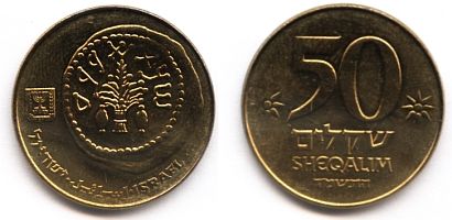 50 Sheqalim Alloy: aluminium-bronze (copper 92%, aluminium 6%, nickel 2%) Diameter: 28 mm |