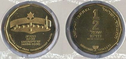 * The 'Mem' Proof mint mark on the obverse of this coin is most probably the result of an error. All 1/2 NIS coins with a Hanukka Lamp on their obverse, minted since 1993/5754 have no obverse mint mark. The obverse design of this 'Polish Lamp' 1/2 NIS coin was copied from the 'Polish' Lamp' commemorative 1 Sheqel Proof coin issued in 1981/5752, but without obliterating the 'Mem' Proof mint mark. As none of the 1993+ Hanukka coins in sets are Proof issues, but Uncirculated coins only, the 'Mem' Proof mint mark is misplaced and must therefore originate from an oversight by the Dutch Mint, the Bank of Israel and the Israel Government Coins and Medals Corporation. |
