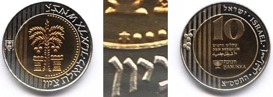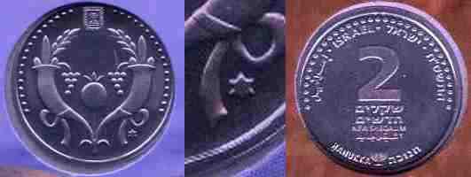 The 5768/2007-dated NIS 1 Hanukka coin is made of cupro-nickel (non-magnetic), cat. # 163a - see table above. |