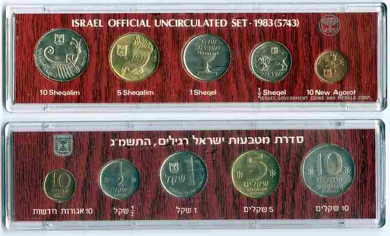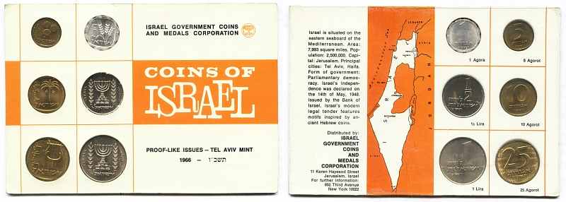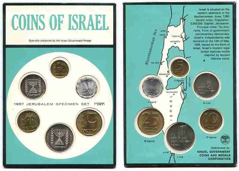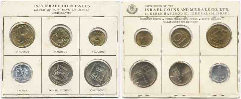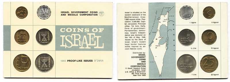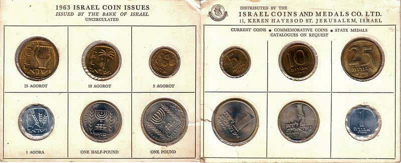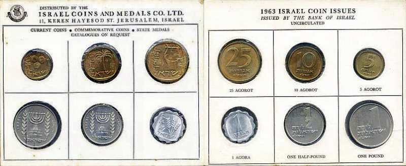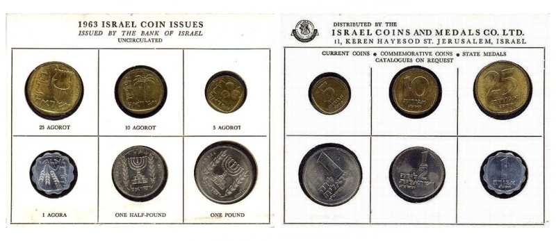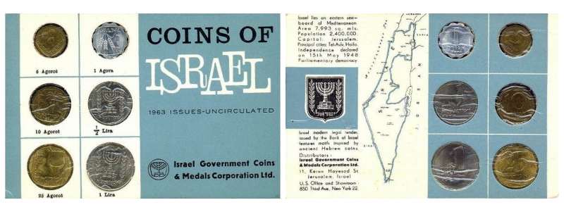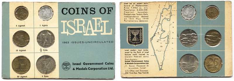 Catalog #: MS17 Coins in set: 6 Description: Uncirculated 1963 (5723) Issues, with inverted Agora coin Quantity issued: 10,455 sets total - sets MS16 & MS17 combined Value: USD 20.00 |