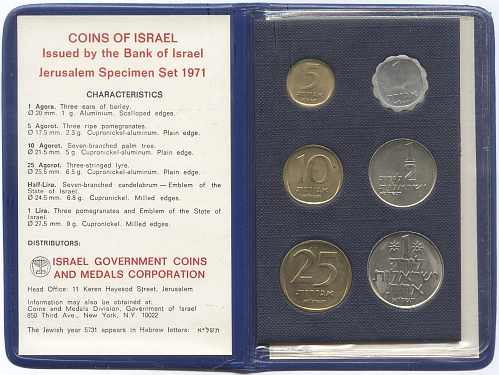 Catalog #: MS27 Coins in set: 6 Description: Jerusalem Specimen Set 1971/5731, Uncirculated regular trade coins Quantity issued: 32,543 sets total - Type I & II combined Value: USD 4.00 |
