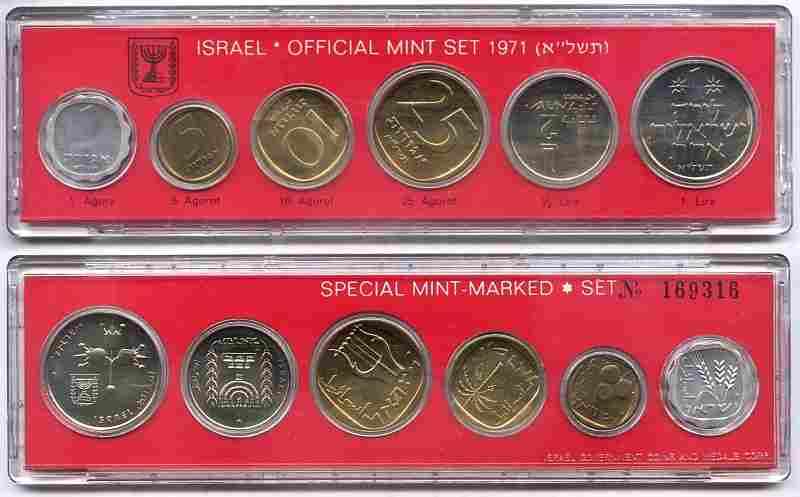 Catalog #: MS28 Coins in set: 6 - Obverse mint marked with Star of David Description: Official Mint Set 1971/5731 Quantity issued: 125,921 sets Value: USD 3.00 |