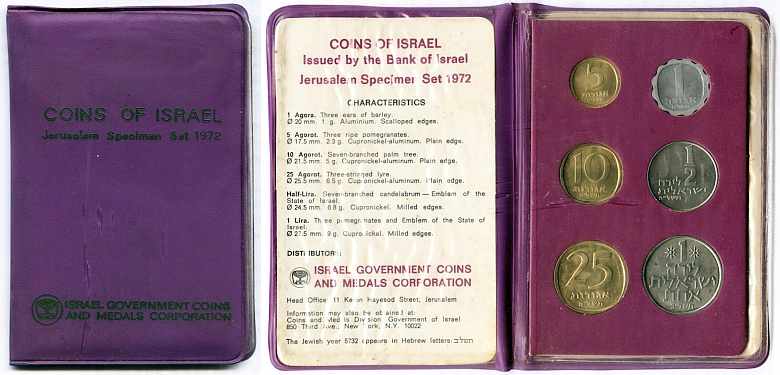 Catalog #: MS30 Coins in set: 6 - Obverse mint marked with Star of David Description: Official Mint Set 1972/5732 Quantity issued: 68,513 sets Value: USD 3.00 |