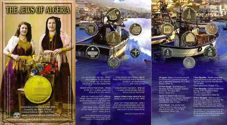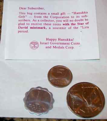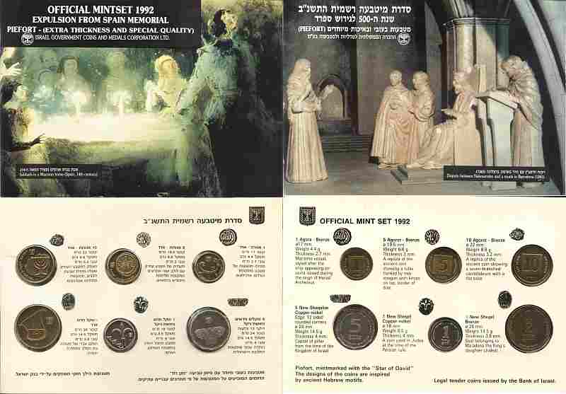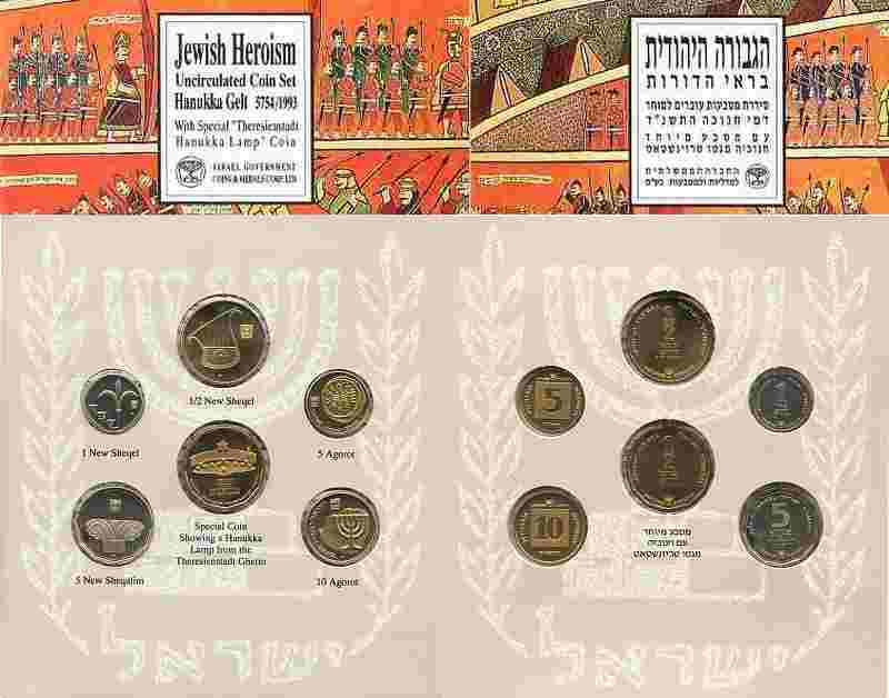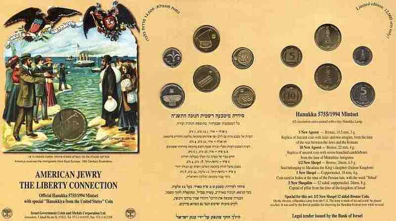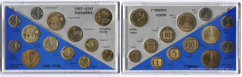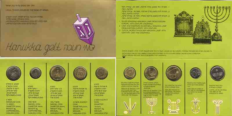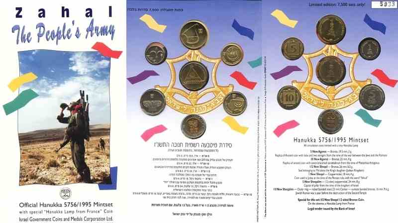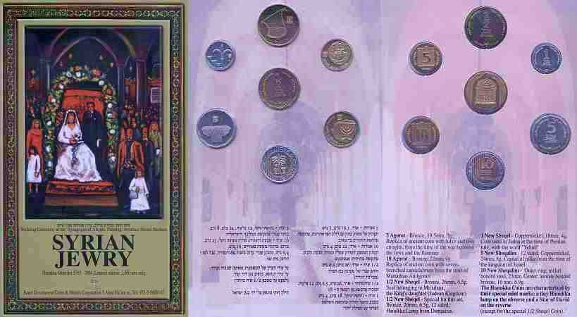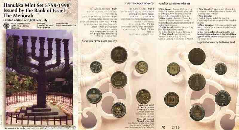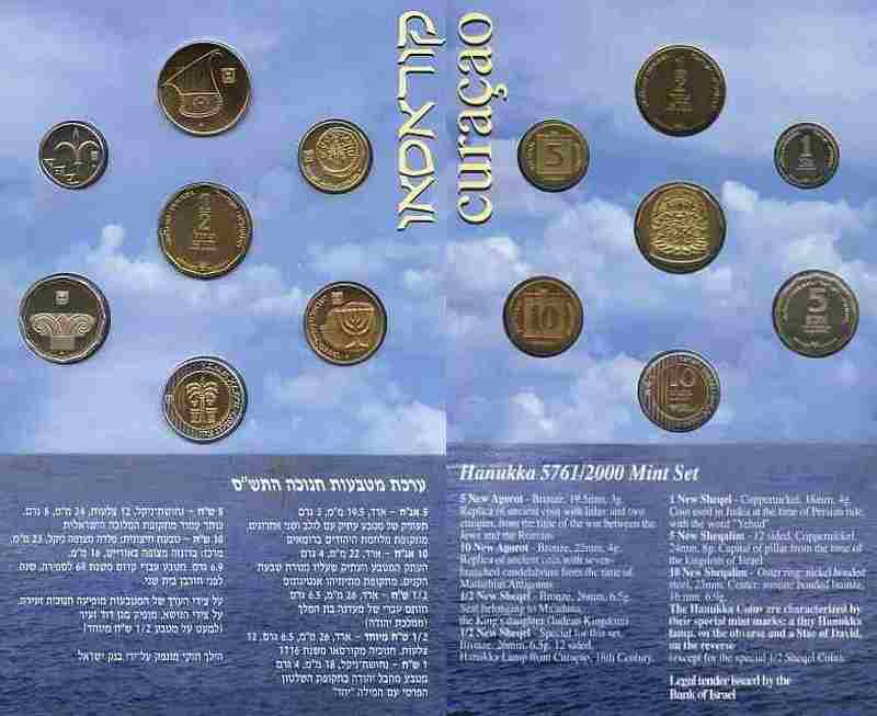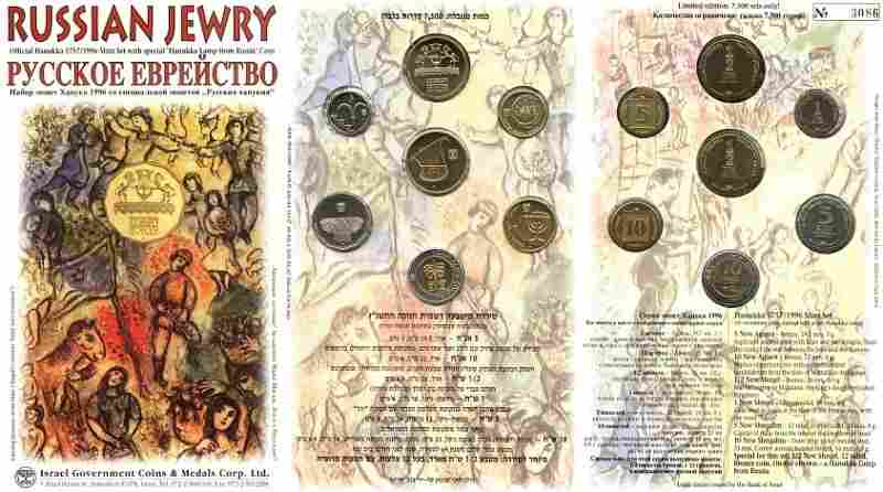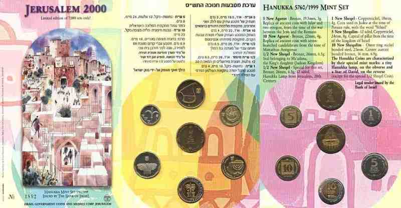 Catalog #: MS102 Coins in set: 8 - Hanukka Lamp mint mark on reverse Packing: Multicolored illustrated folder Quantity issued: 3,000 sets Value: USD 45.00 |