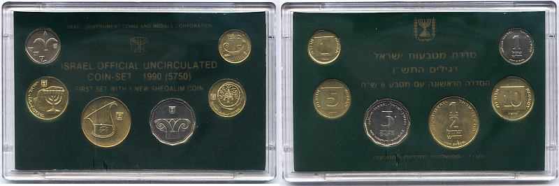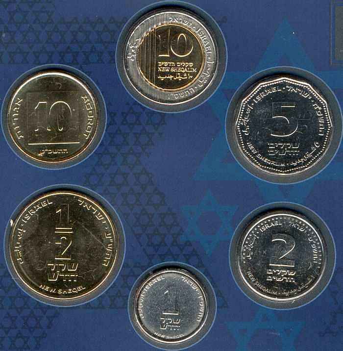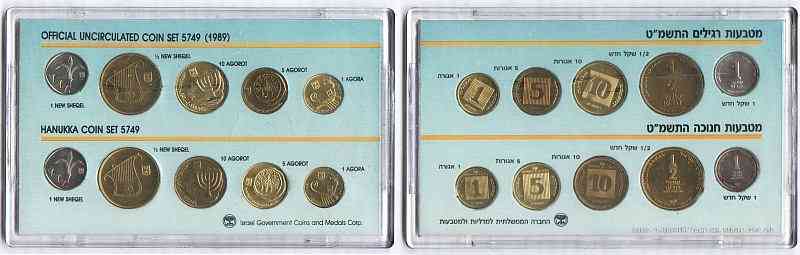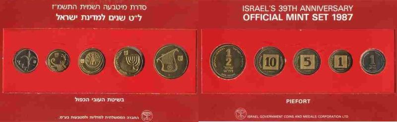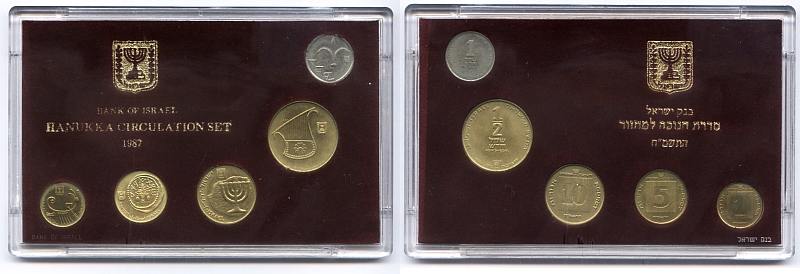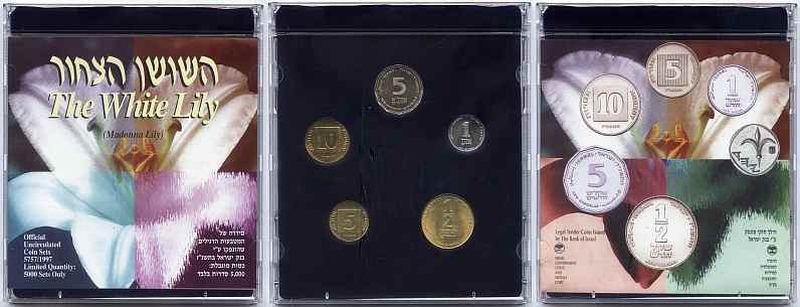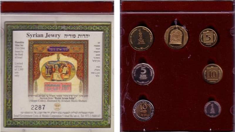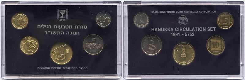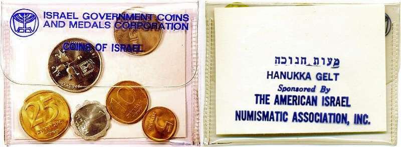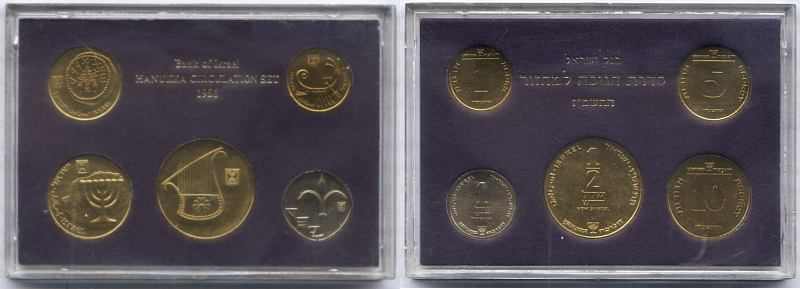 Catalog #: MS104a Coins in set: 6 - Hanukka Lamp mint mark on reverse Packing: Grey card in dark grey sleeve decorated with Hanukka Lamp Quantity issued: 1,800 sets Value: USD 40.00 |