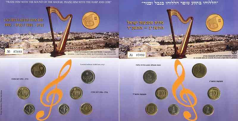 Catalog #: MS94 Coins in set: 6 - random-dated Packing: Multicolored illustrated folder Quantity issued: unknown small quantity (apparently less than 1,000 sets) distributed to Bank of Israel employees and dignitaries only Value: USD 45.00 |