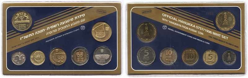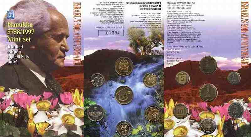 Catalog #: MS77 Coins in set: 7 - Hanukka Lamp mint mark on reverse Description: Official Hanukka Mint Set 5758/1997 Packing: Plastic box with illustrated leaflet Quantity issued: 10,000 sets total - Type I & II combined Value: USD 38.00 |