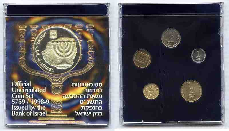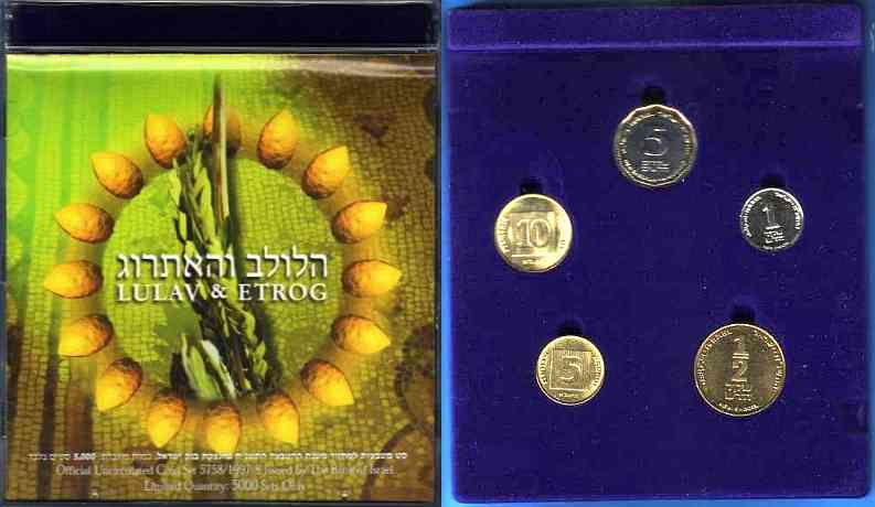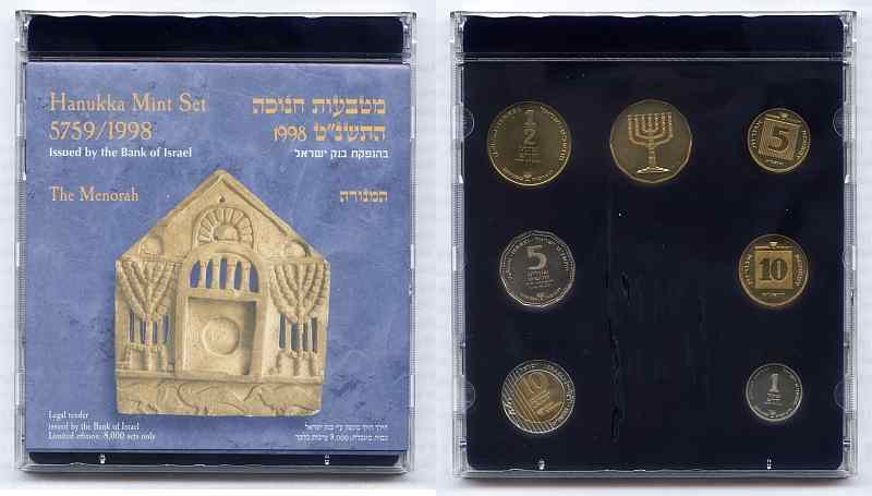 Catalog #: MS80 Coins in set: 7 - Hanukka Lamp mint mark on reverse Description: Official Hanukka Mint Set 5759/1998 Packing: Plastic box with illustrated leaflet Quantity issued: 8,000 sets total - Type I & II combined Value: USD 38.00 |