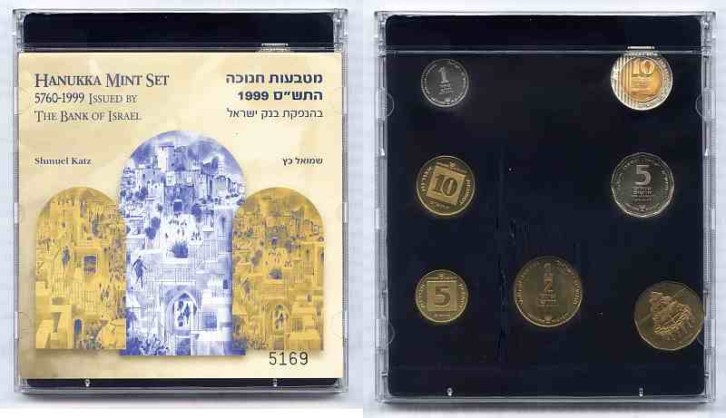 Catalog #: MS83 Coins in set: 7 - Hanukka Lamp mint mark on reverse Description: Official Hanukka Mint Set 5760/1999 Packing: Plastic box with illustrated leaflet Quantity issued: 7,000 sets total - Type I & II combined Value: USD 38.00 |