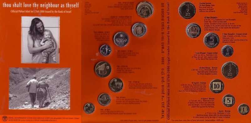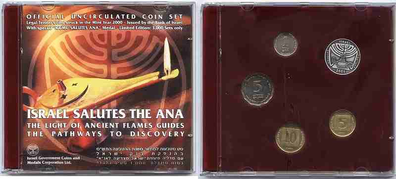 Catalog #: MS84 Coins in set: 4 + "Israel Salutes ANA" medal Description: Official Uncirculated Set 5760/2000 Packing: Plastic box with illustrated leaflet Quantity issued: 3,000 sets Value: USD 30.00 |