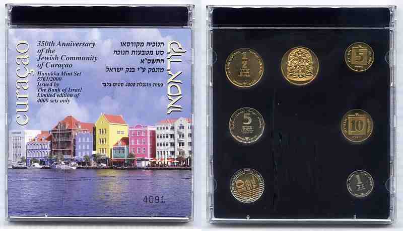 Catalog #: MS86 Coins in set: 7 - Hanukka Lamp mint mark on reverse Description: Official Hanukka Mint Set 5761/2000 Packing: Plastic box with illustrated leaflet Quantity issued: 4,000 sets total - Type I & II combined Value: USD 35.00 |