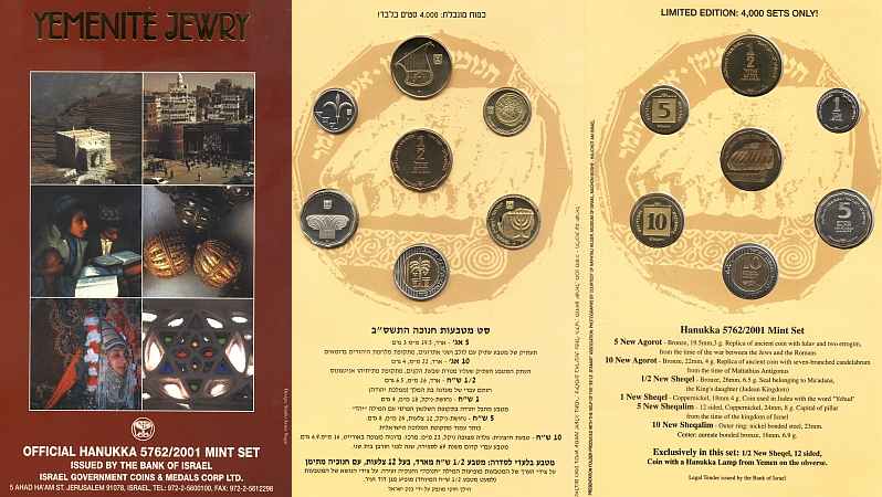 Catalog #: MS87 Coins in set: 7 - Hanukka Lamp mint mark on reverse Description: Official Hanukka Mint Set 5762/2001 Packing: Multicolored illustrated folder Quantity issued: 4,000 sets total - Type I & II combined Value: USD 40.00 |