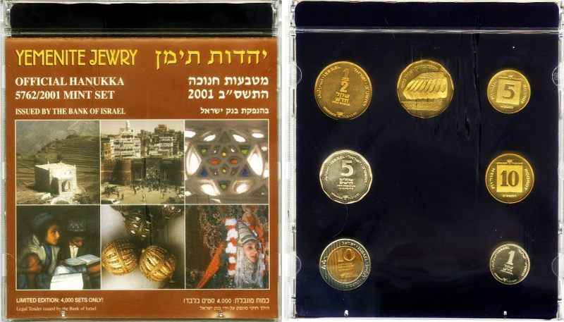 Catalog #: MS88 Coins in set: 7 - Hanukka Lamp mint mark on reverse Description: Official Hanukka Mint Set 5762/2001 Packing: Plastic box with illustrated leaflet Quantity issued: 4,000 sets total - Type I & II combined Value: USD 40.00 |