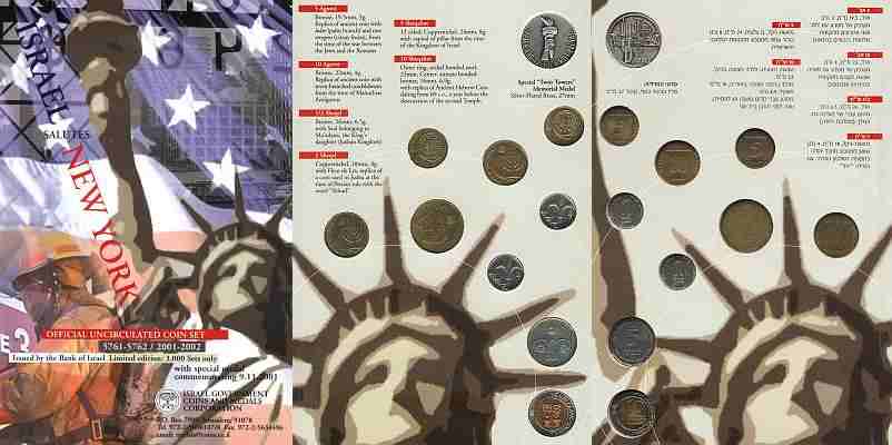 Catalog #: MS89 Coins in set: 9 + "Twin Towers" medal, silver plated brass, 27 mm Description: Official Uncirculated Set 5761/2001 & 5762/2002 Packing: Multicolored folder Quantity issued: 3,000 sets Value: USD 40.00 |