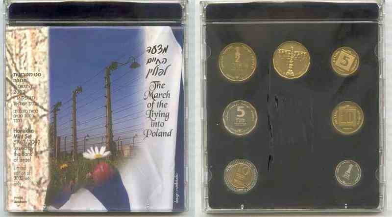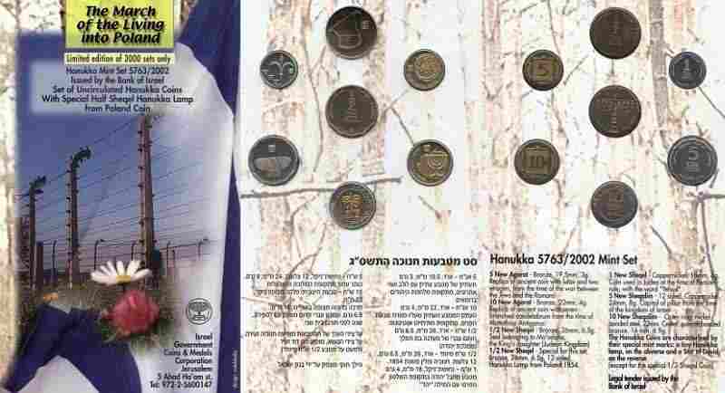 Catalog #: MS90 Coins in set: 7 - Hanukka Lamp mint mark on reverse Description: Official Hanukka Mint Set 5763/2002 Packing: Multicolored illustrated folder Quantity issued: 3,000 sets total - Type I & II combined Value: USD 40.00 |