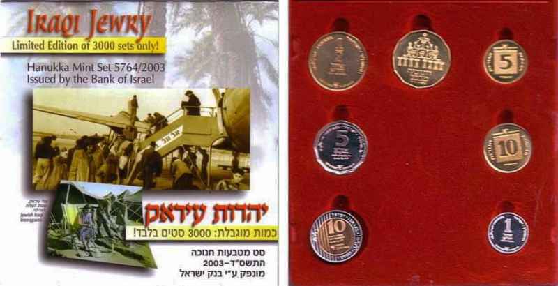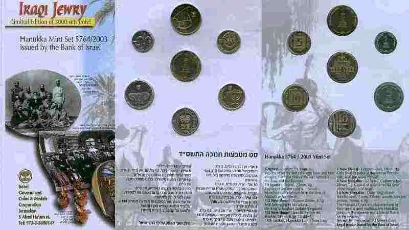 Catalog #: MS92 Coins in set: 7 - Hanukka Lamp mint mark on reverse Description: Official Hanukka Mint Set 5764/2003 Packing: Multicolored illustrated folder Quantity issued: 3,000 sets total - Type I & II combined Value: USD 40.00 |