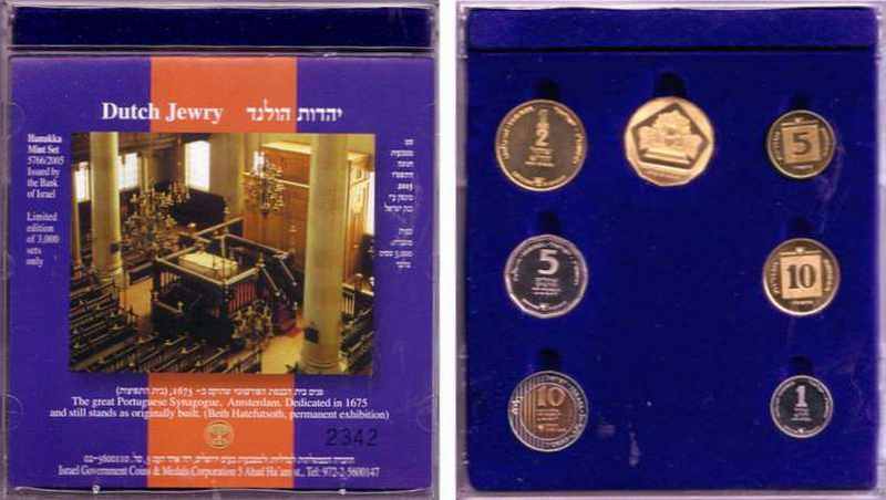 Catalog #: MS99 Coins in set: 7 - Hanukka Lamp mint mark on reverse Description: Official Hanukka Mint Set 5766/2005 Packing: Plastic box with illustrated leaflet Quantity issued: 3,000 sets total - Type I & II combined Value: USD 40.00 |