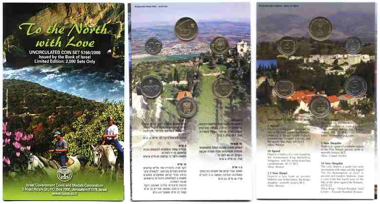 Catalog #: MS100 Coins in set: 6 Description: Uncirculated Set 5766/2006 Packing: Multi-colored folder Quantity issued: 2,000 sets Value: USD 38.00 |