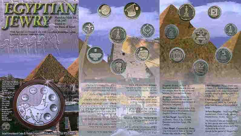 Catalog #: MS101 Coins in set: 7 - Hanukka Lamp mint mark on reverse Description: Official Hanukka Mint Set 5767/2006 Packing: Multicolored illustrated folder Quantity issued: 3,000 sets Value: USD 40.00 |