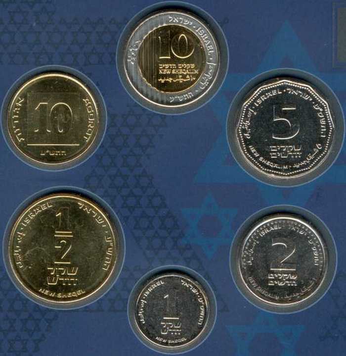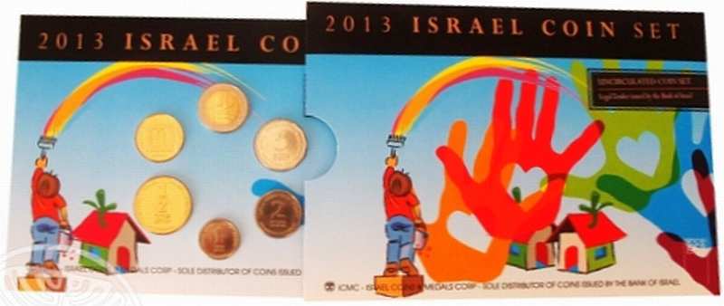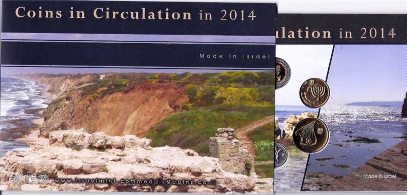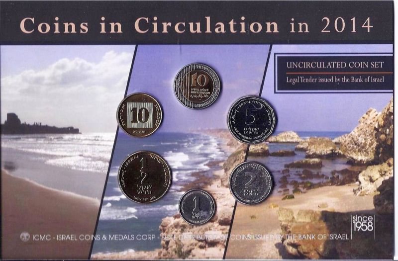 Israel Uncirculated Coin Set "Coins in Circulation in 2014" 10 Agorot dated 5773/2013, 1/2 NIS dated 5772/2012, 1 NIS dated 5773/2013, 2 NIS dated 5771/2011, 5 NIS dated 5773/2013, 10 NIS dated 5713/2013 |