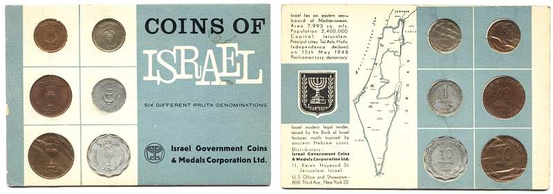 Catalog #: MS5 Coins in set: 18 Description: Complete type set of 18 Pruta & Agorot coins, uncirculated & circulated Inside print: Old logo of the predecessor of the IGCMC, Israel Coins and Medals company, Jerusalem Israel Remark: Different types of 10 Pruta and 1