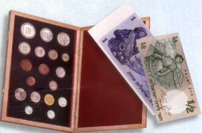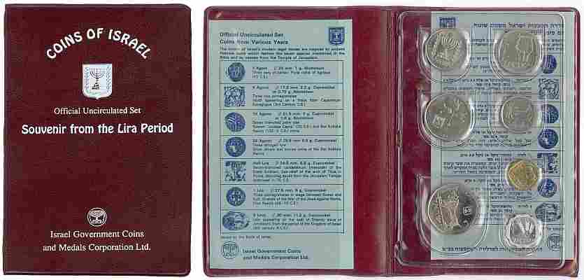 Catalog #: HS11 Coins in set: 18 Description: Complete type set of 18 Pruta & Agorot coins, uncirculated & circulated; 1/2 Lira (cat. # 29) and 1 Lira (#30) banknotes, uncirculated Quantity issued: 110 sets Value: USD 260.00 |