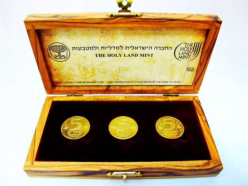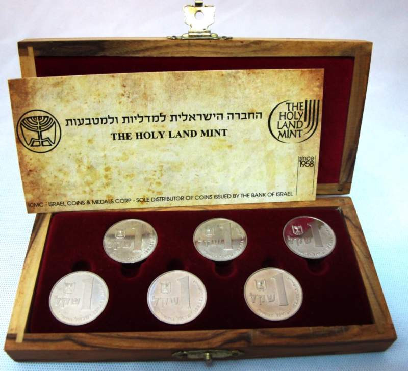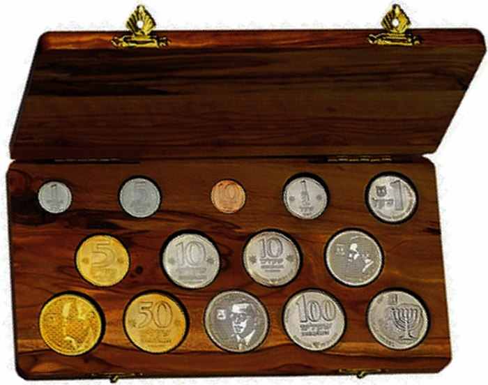 Type Set of 14 New Agora-Sheqel Coins of the Sheqel Period Olive wood case |