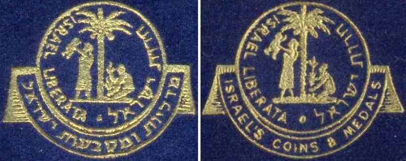 Comparison between Hebrew and English company logo on inside cover of 16-coin sets |