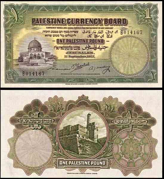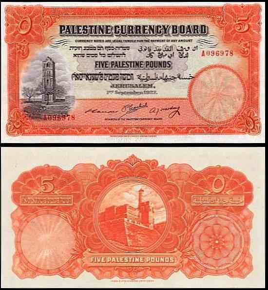 On the obverse of the 5 Palestine Pounds currency note appears the White Tower of Ramle, also known as the Ramle Crusaders' Tower, the Tower of the Forty Martyrs, and the White Mosque. The tower, erected in 1318 AD, was originally part of the compound of the White Mosque, built in the 8th century by Caliph Suleiman. The Tower of David is shown on the reverse of the 5 Palestine Pounds note and all other British Mandate currency notes. |