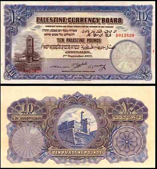 On the obverse of the 10 Palestine Pounds currency note appears the White Tower of Ramle. The Tower of David is featured on the reverse of the 10 Palestine Pounds note, and all other British Mandate currency notes. |
