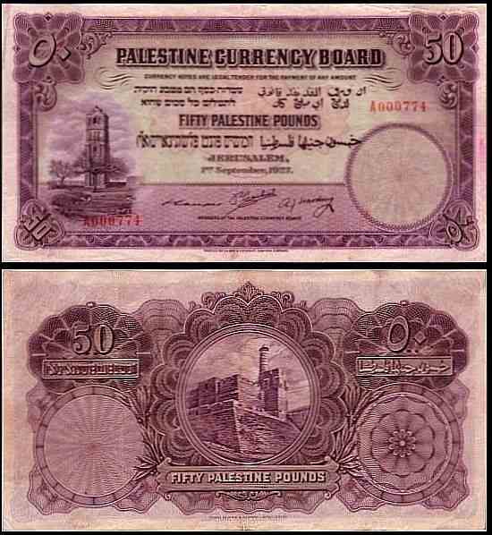 On the obverse of the 50 Palestine Pounds currency note appears the White Tower of Ramle. The Tower of David is depicted on the 50 Palestine Pounds note, as well as on the reverse of all other British Mandate currency notes. |