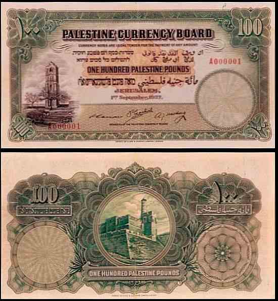 On the obverse of the 100 Palestine Pounds currency note appears the White Tower of Ramle. The Tower of David is featured on the reverse of the 100 Palestine Pounds note, and all other British Mandate currency notes. |
