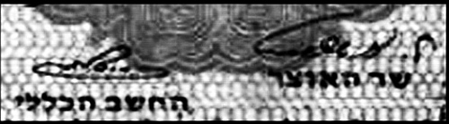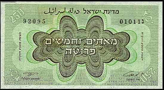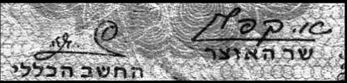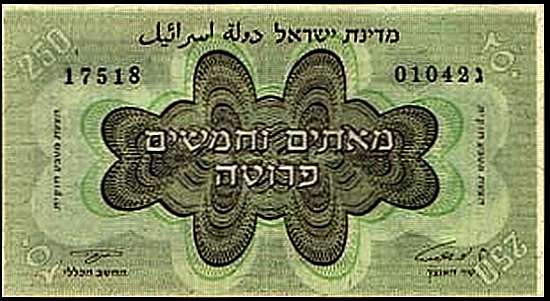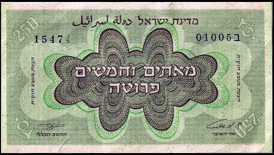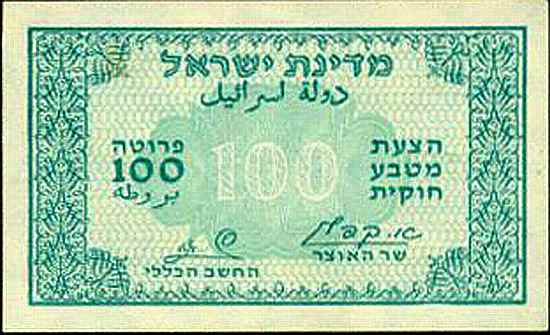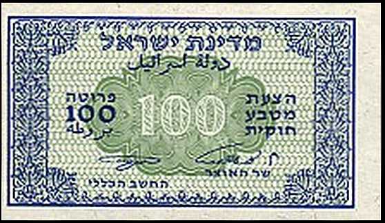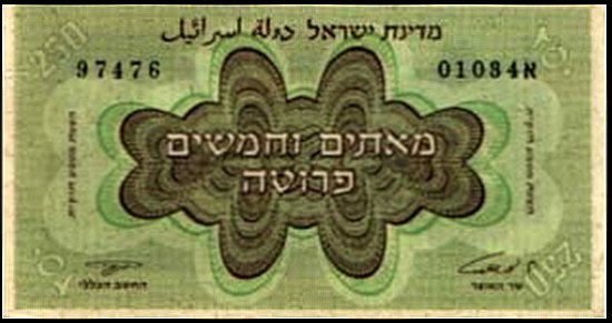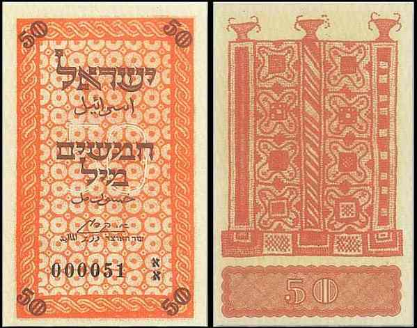 When the leaders of the Yishuv (the Jewish community in British Mandatory Palestine) were engaged in establishing the new State, one of the matters they had to deal with was its currency. As the name of the new nation had not been decided, the question arose as to what would be printed on the banknotes. The banknotes could not be printed in this country as the British Mandate had not yet expired, and also for lack of the required technical expertise. At the same time it was clear that no reputable foreign firm would print money for a nonexistent state. After considerable effort, Siegfried Hoofien, then Chairman of the Board of the Anglo-Palestine Bank, persuaded the American Banknote Company of New York to print the banknotes. To obviate the need for State Department approval for printing banknotes of a foreign country, the notes as ordered gave no indication of their being legal tender. The legend "Legal tender for payment of any amount" was subsequently overprinted. In addition, the company stipulated that its name should not appear on the notes. The design of the banknotes was based on different combinations of guilloches in the company's stock, some of which were used for printing banknotes for China! When the banknotes were ordered, no one yet knew what the name of the new state would be, let alone its currency. It was therefore decided to print "Palestine Pound" on the notes, the currency of the mandate. |