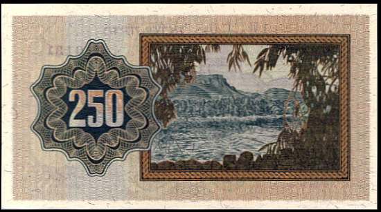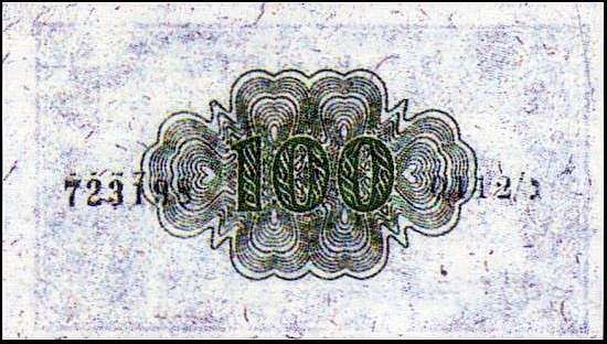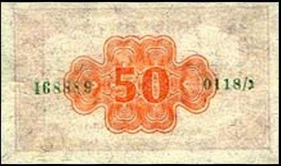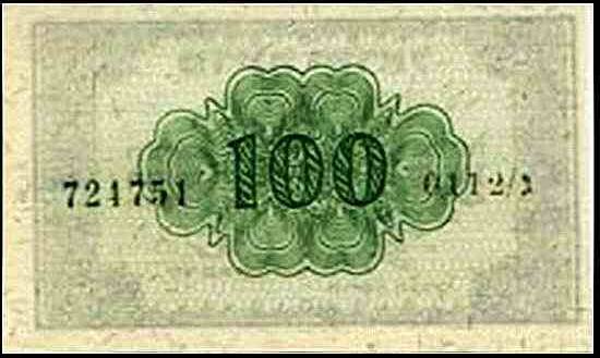 In many instances the Menorah is only visible when the note is held against an ultra-violet lamp. On the image of the reverse of cat. # 13d, part of the Menorah is reasonably clearly visible, the left arm running through the digit 5 of the serial number on the left. |