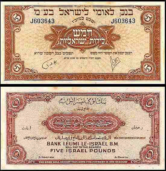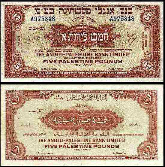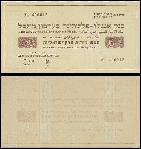 5 Palestine Pounds Date of issue: 18 August 1948 |