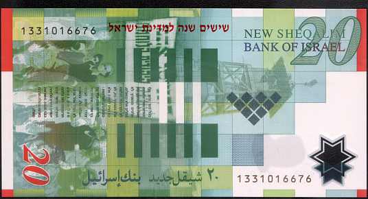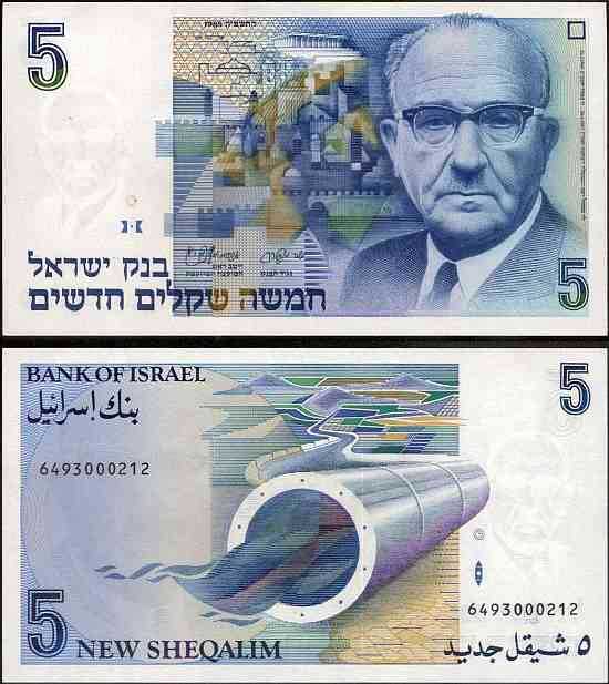 The NIS 5 banknote of series I of the New Sheqel shows on its obverse a portrait of Levi Eshkol (1895-1969), third prime minister of Israel from 1963 until his death in February 1969. Eshkol, who was finance minister during the twelve years preceding his premiership, is credited with extensive economic, industrial and infrastructural progress during the first two decades of independence. Also depicted on the banknote's obverse is the Jerusalem skyline, a city reunited during Eshkol's tenure as prime minister. On the reverse, coupled water pipes, flowing water, and the stark contrast between verdant fields and barren wasteland, epitomizes Levi Eshkol's preoccupation with building the fledgling nation's infrastructure, the highlight being the completion in 1964 of the national water conduit project, carrying water through underground pipes and surface canals from the Sea of Galilee to central Israel and the Negev desert. |