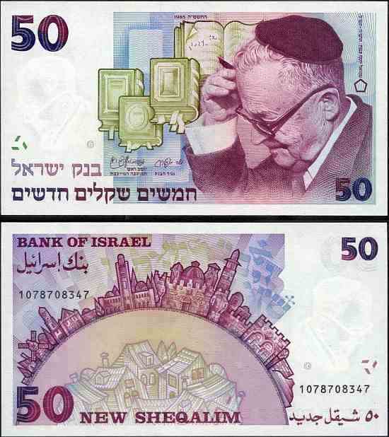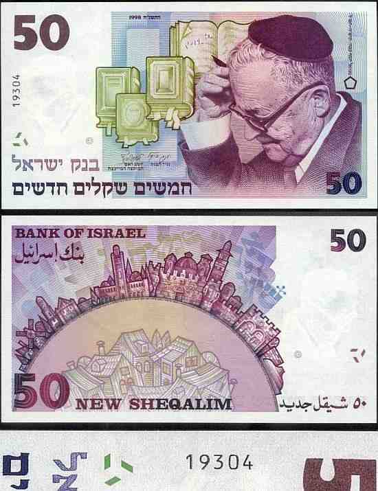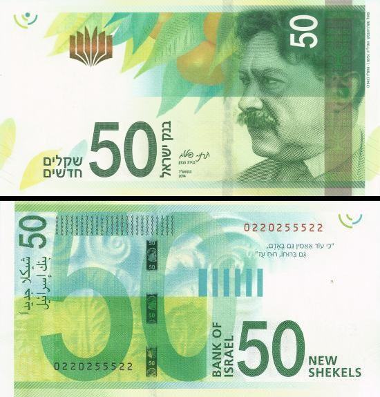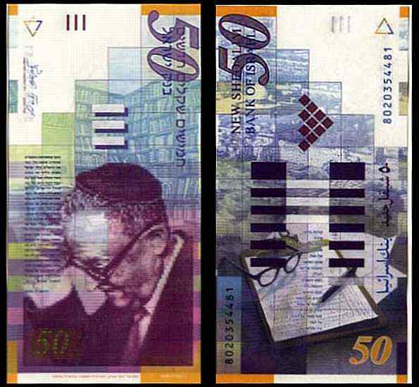 The NIS 50 banknote of series III of the New Shekel (note the departure from the English transliteration Sheqel and Sheqalim in favor of Shekel and Shekels) depicts on its obverse Shaul Tchernichovsky (1875-1943), physician, poet and translator. Tchernichovsky is considered one of the great Hebrew poets, identified with nature poetry, and as a poet was greatly influenced by the culture of ancient Greece.