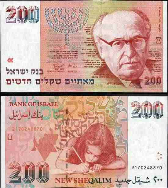 the obverse of the NIS 200 banknote of series I of the New Sheqel.