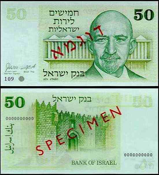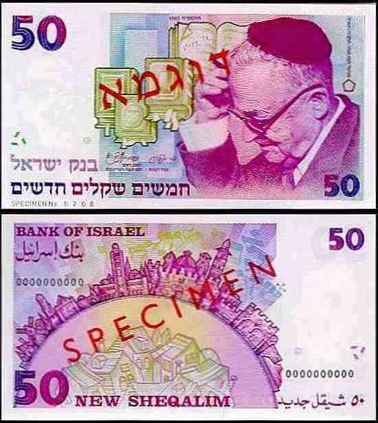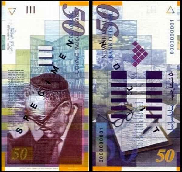 50 New Sheqalim Obverse: Shmuel Yosef (Shai) Agnon Date: 5758/1998 Signatures: Yaakov Frenkel, Governor Bank of Israel; Shlomo Lorincz, Chairman Advisory Committee Material: paper |