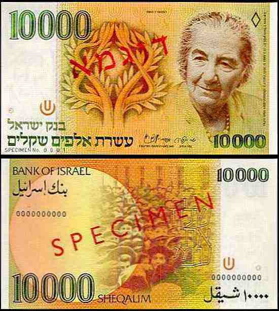 10000 Sheqalim Obverse: Golda Meir Reverse: Golda Meir crowded by Soviet Jews outside Moscow synagogue, 1948 Date: 5744/1984 |