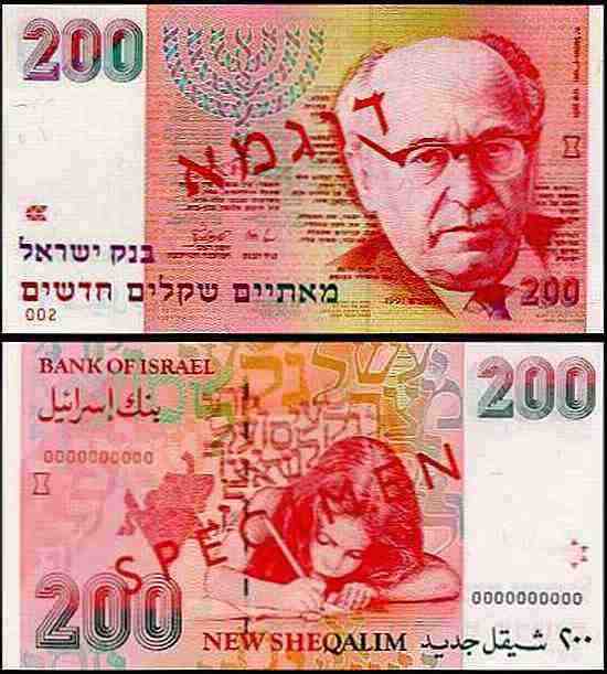 200 New SheqalimObverse: Zalman Shazar Date: 5759/1999 Signatures: Yaakov Frenkel, Governor Bank of Israel; Shlomo Lorincz, Chairman Advisory Committee Material: paper |