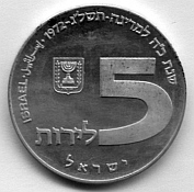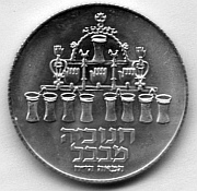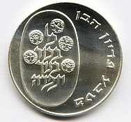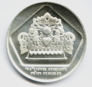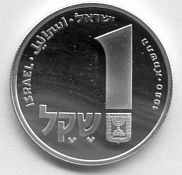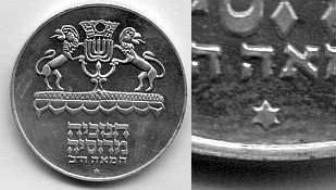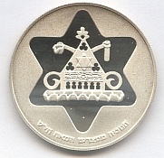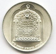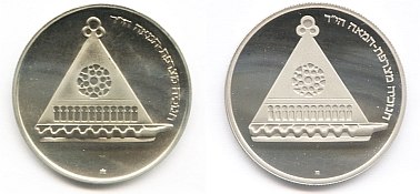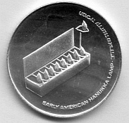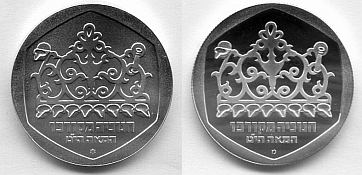 The 1980/5741 Hanukka coin features on its obverse a 19th century Hanukka Lamp from the Greek island of Corfu (Kerkyra). The lamp appears in a hexagonal depression, and is of a dual purpose type, usable as a wall-mounted ornament during most of the year, and as a free-standing Hanukka Lamp during the Feast of Lights. |