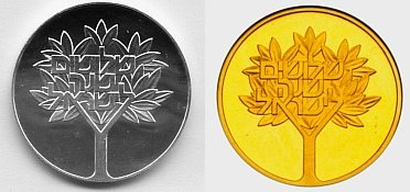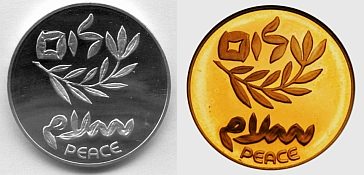 The coin's obverse features the word "Shalom", "Salaam" and "Peace", with an olive branch between the Hebrew and Arabic texts. |